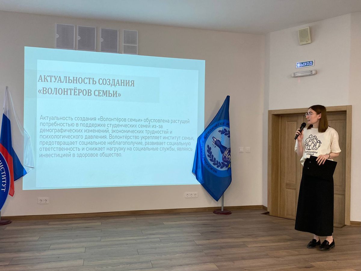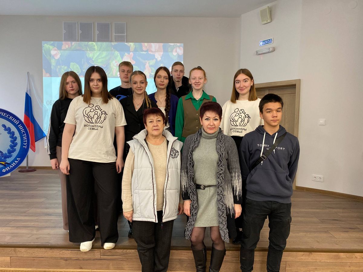 Председатель общественного движения «Волонтёры семьи» Сидорова Ксения и волонтёр Белова Кристина познакомили ребят с историей становления общественного движения «Волонтёры семьи», проведенной работой в рамках этого движения и перспективами его развития. При этом внимание было акцентировано на формировании позитивных установок студенческой молодежи на добровольческую деятельность, участии в подготовке и проведении массовых социально-культурных, информационно- просветительских и спортивных мероприятий в молодежной и семейной среде и развитии волонтёрского движения (семейного волонтёрства) в филиале и колледже.