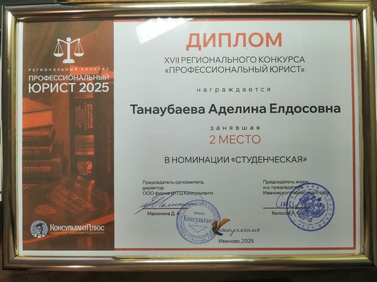 В этот день были подведены итоги, и победительницей престижного конкурса стала наша студентка 3 курса Ивановского филиала Международного юридического института Танаубаева Аделина, занявшая почетное 2 место в номинации «Студенческая». Нельзя обойти стороной и еще одну нашу студентку 3 курса Славинскую Елизавету, которая получила свидетельство участника данного конкурса и достойно прошла в финал. После объявления итогов, были традиционно вручены ценные призы от Консультант Плюс, и завершилось данное мероприятие великолепным концертом от творческого объединения "Классика".